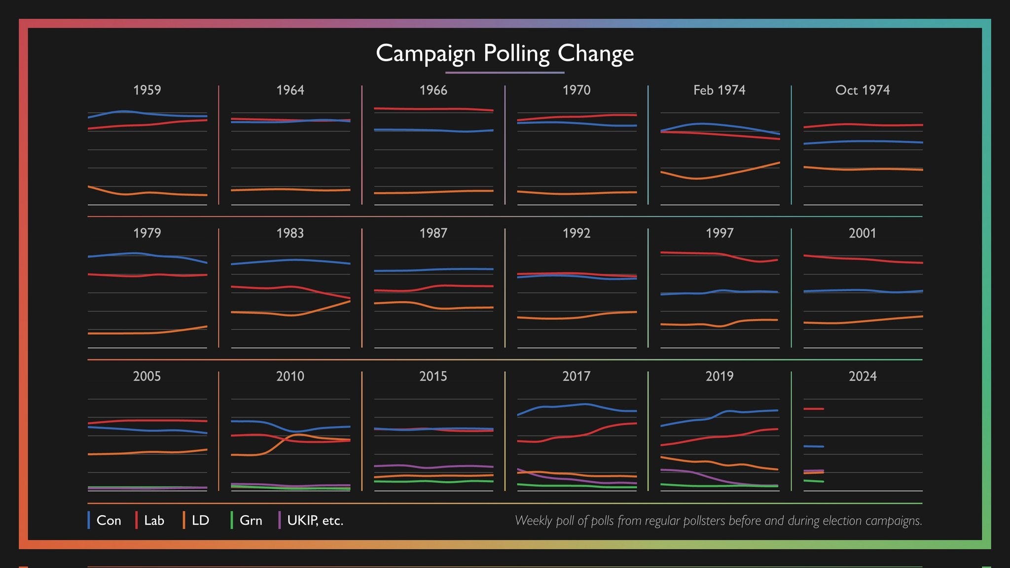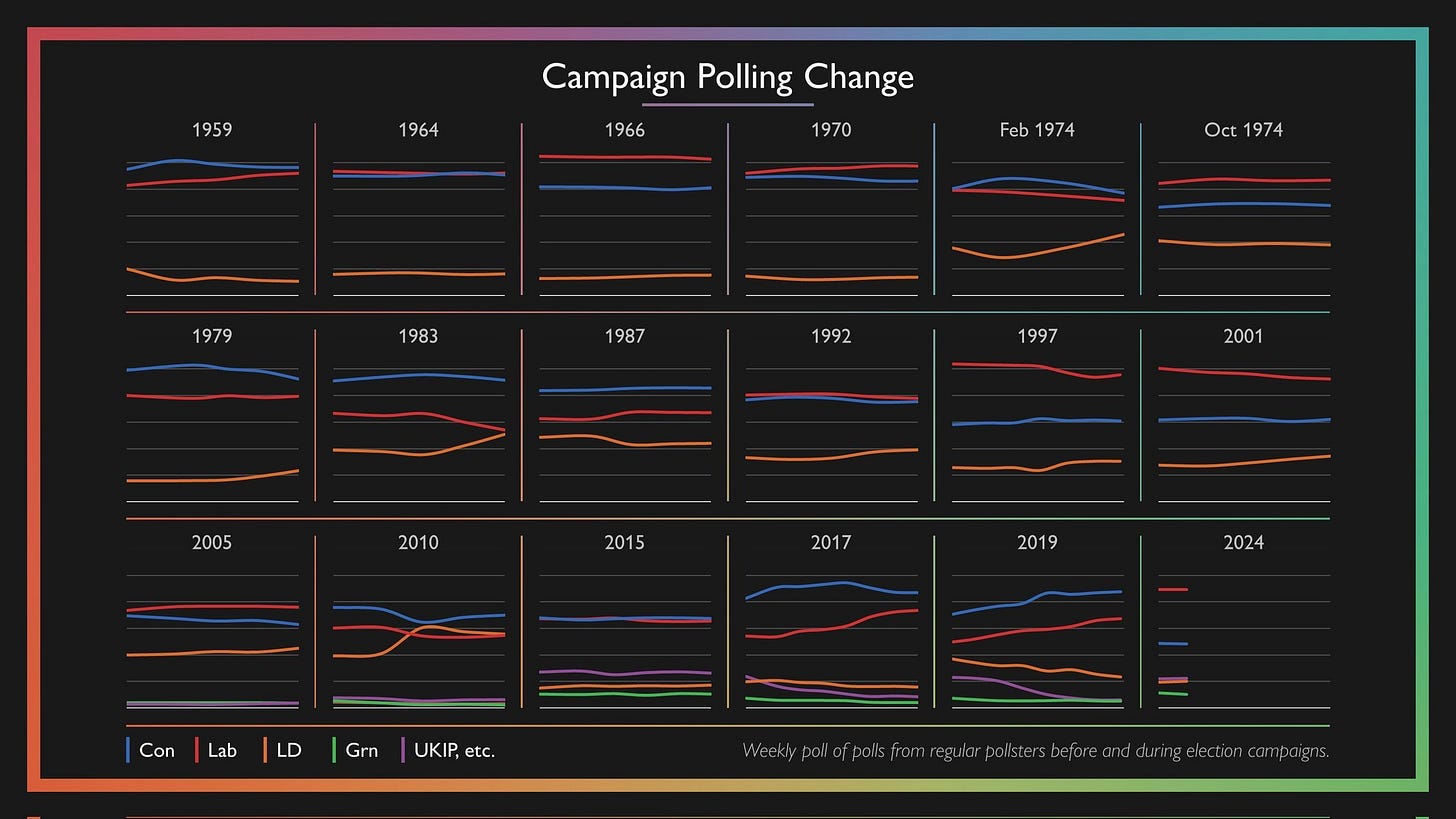 That said, the comparison does only go so far. The Tories extended their lead in the 1955 election. It was not an example of an opposition winning a lukewarm landslide to take office for the first time. Sir Keir Starmer is, in this sense, a pioneer and my strong sense that the election is all but over is confirmed by the chart below. This is a graphic illustration of how little a campaign usually matters.